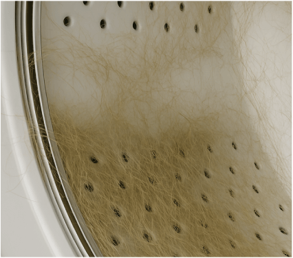 Hair that normally survives detergent is chemically broken down, allowing it to rinse away with the wash water.